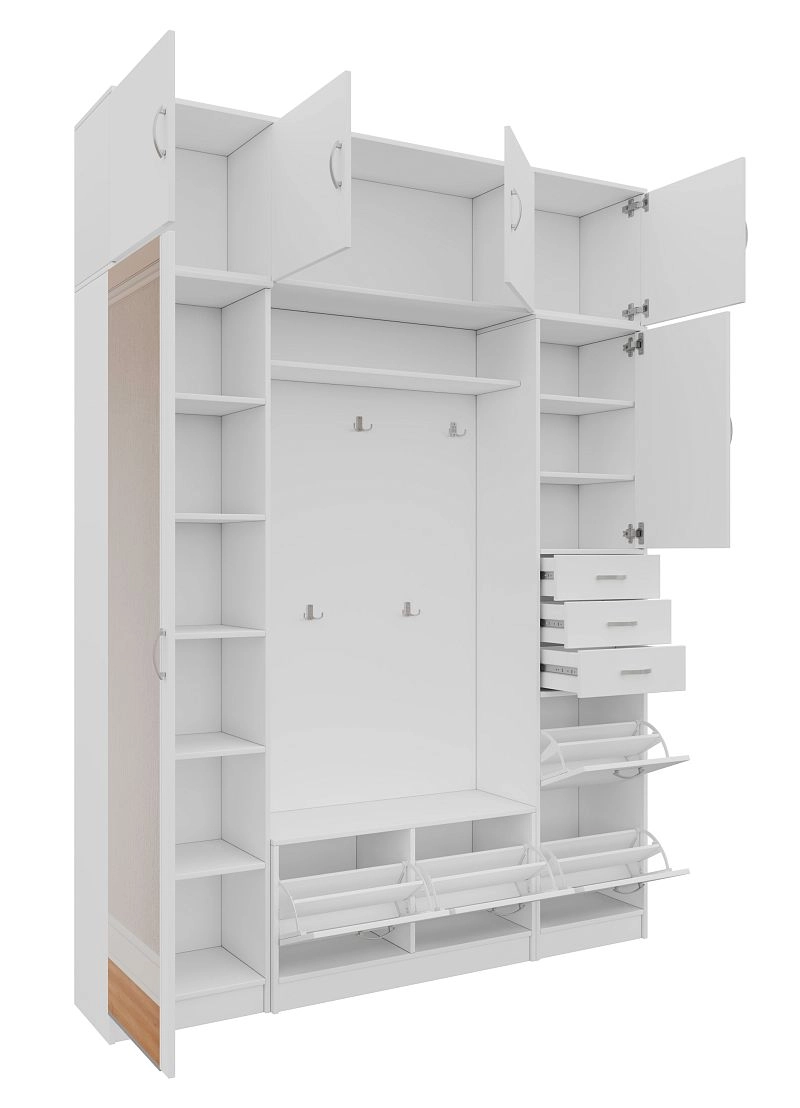 Прихожая Ольга-8 с антресолями Белый продаётся в разнообразных цветовых решениях. Выберите один из 76 цветов корпуса и один из 74 цветов фасада, чтобы получить неповторимый дизайн своей прихожей. Только у нас вы можете купить эту прихожую из высококачественных материалов по самой низкой цене.