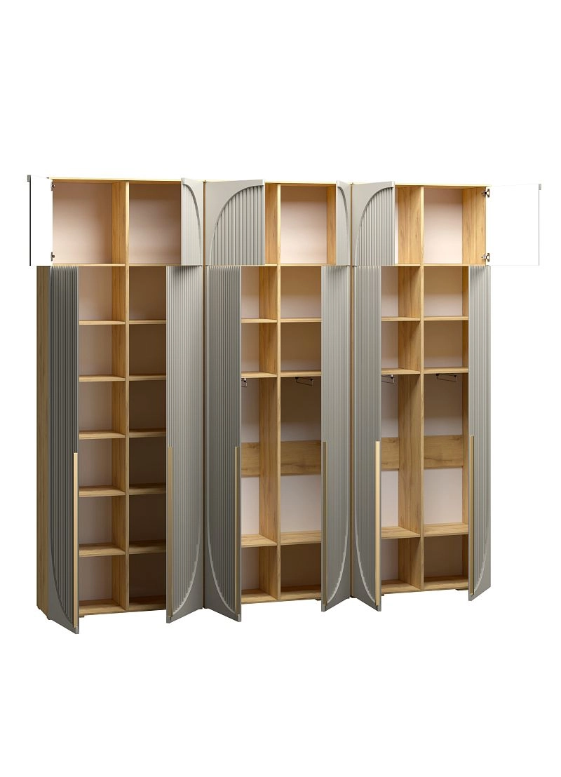 Размер отделений в каждом наполнении изготавливается по стандарту фабрики и может отличаться от фото. Если вам необходимы определенные размеры отделений в наполнении согласуйте это в чате с менеджером. При высоте шкафа 230-270 см антресоль слитная, 280-310 см съемная.
